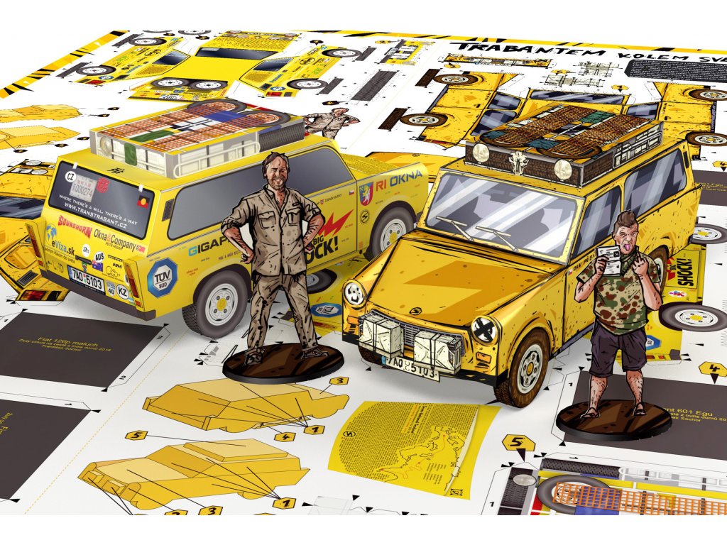 Dva papírové modely Egu, dva modely malucha. Chtěli jsme model tak jednoduchý, jako je trabant sám. Model, který dáte dohromady bez speciálního nářadí kdekoli a kdykoli. A nejen trabant! Taky maluch, a k tomu náčelník a Radek… a dokonce i jeho pas! Pečlivě nakreslené, ale nijak složité na slepení. Navržené tak, aby to šlo snadno a rychle a měli jste z toho radost.